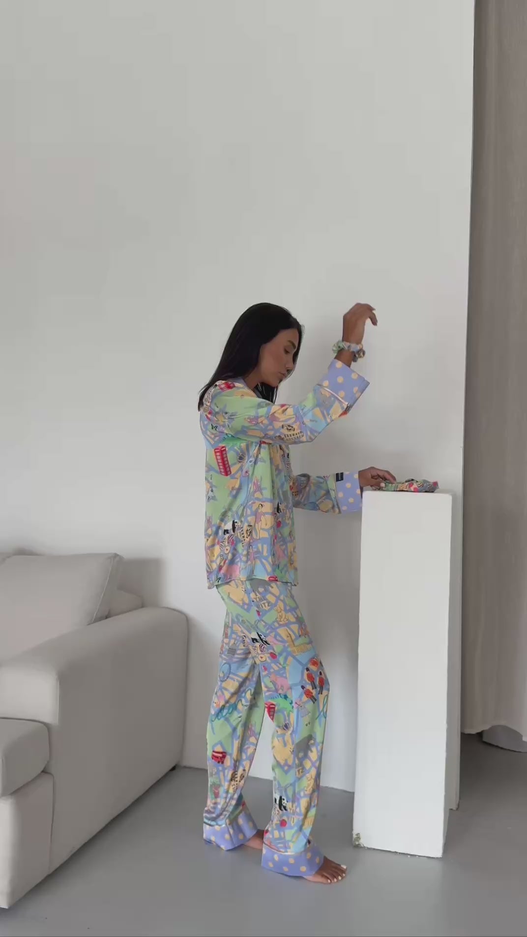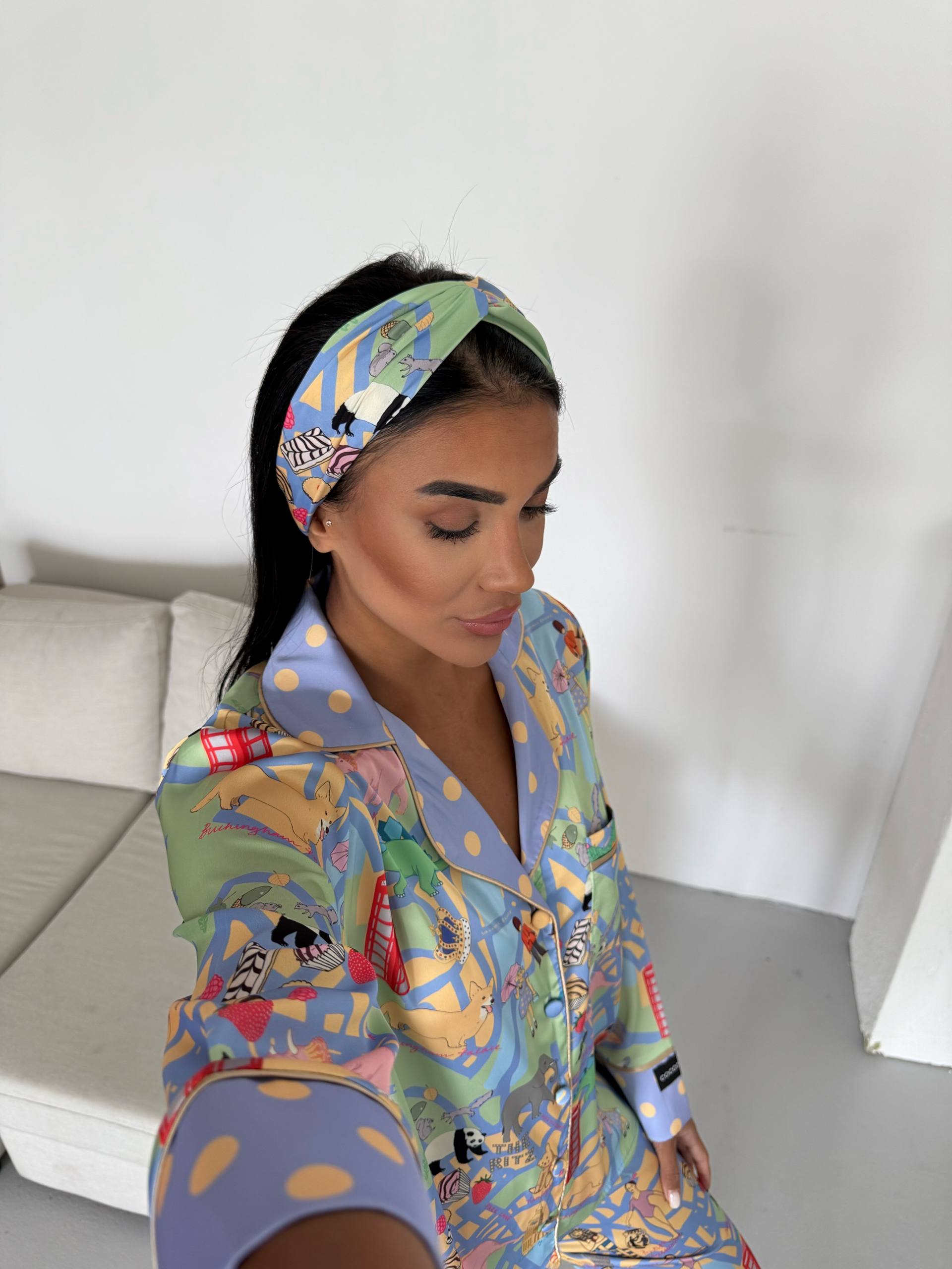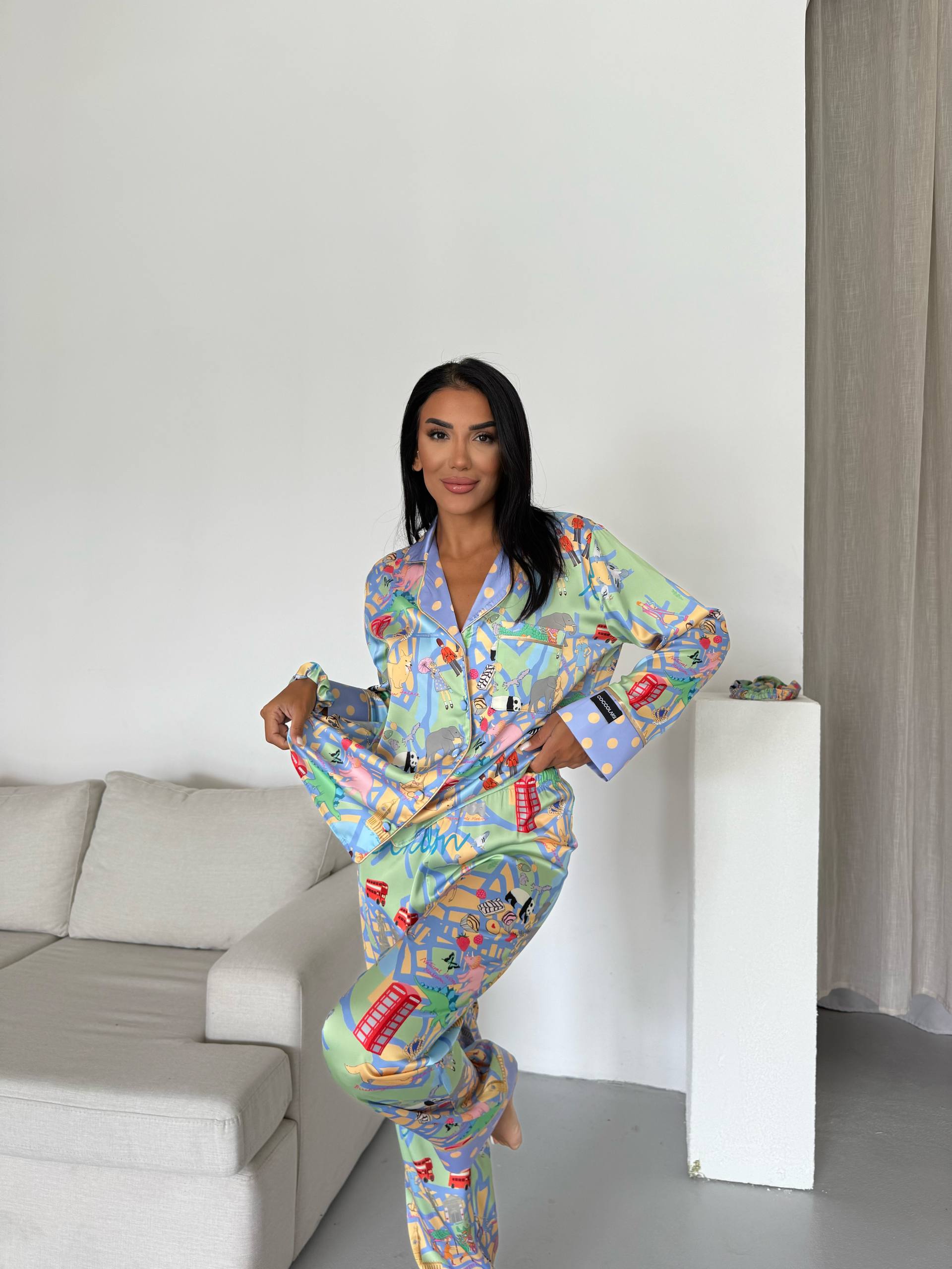 This illustrated city pyjama set is crafted from premium Armani satin, offering a smooth, silky feel with a subtle glossy finish. Featuring playful city scenes, animals, and graphic details, it brings a creative and stylish touch to your nightwear collection.