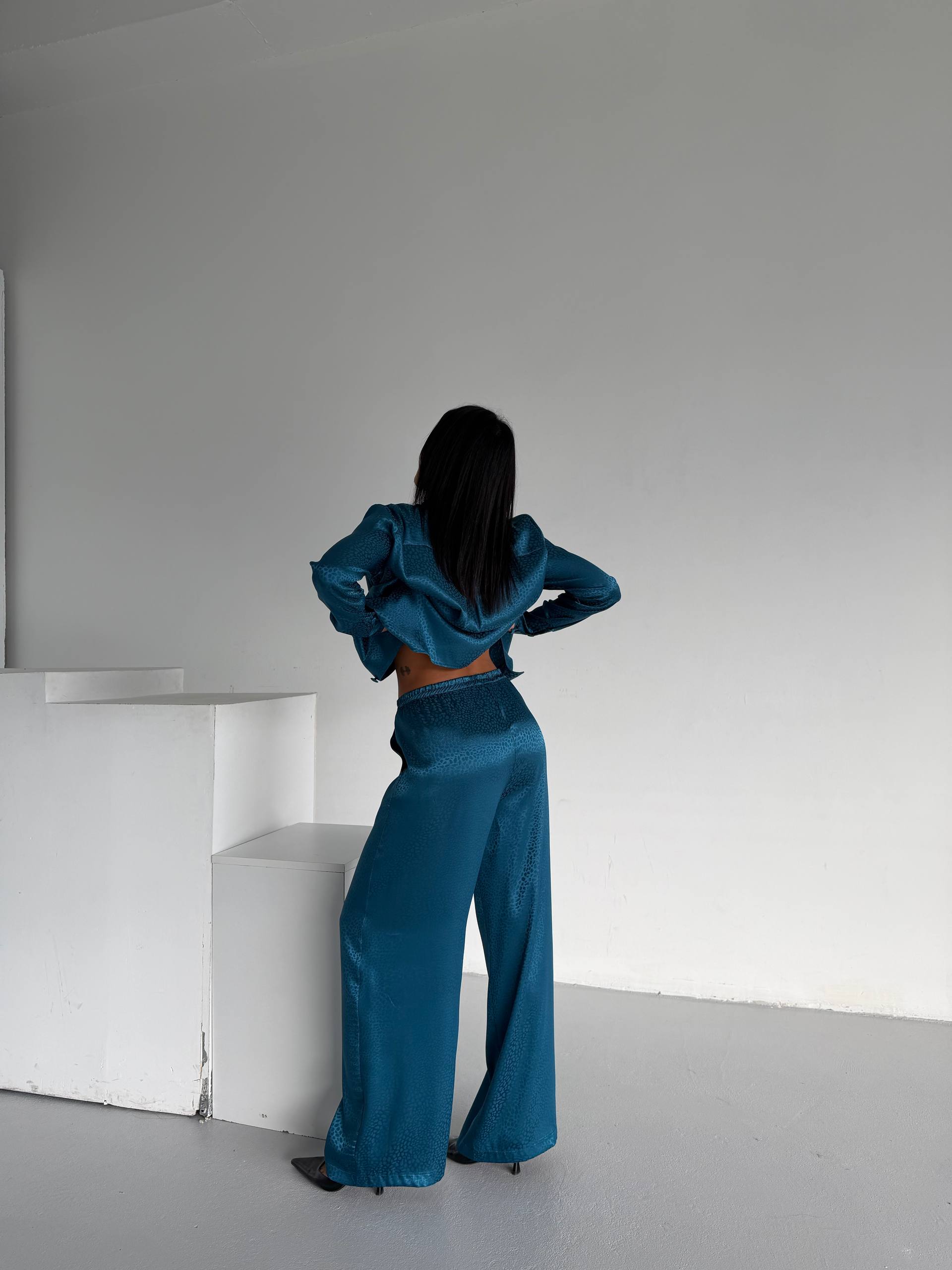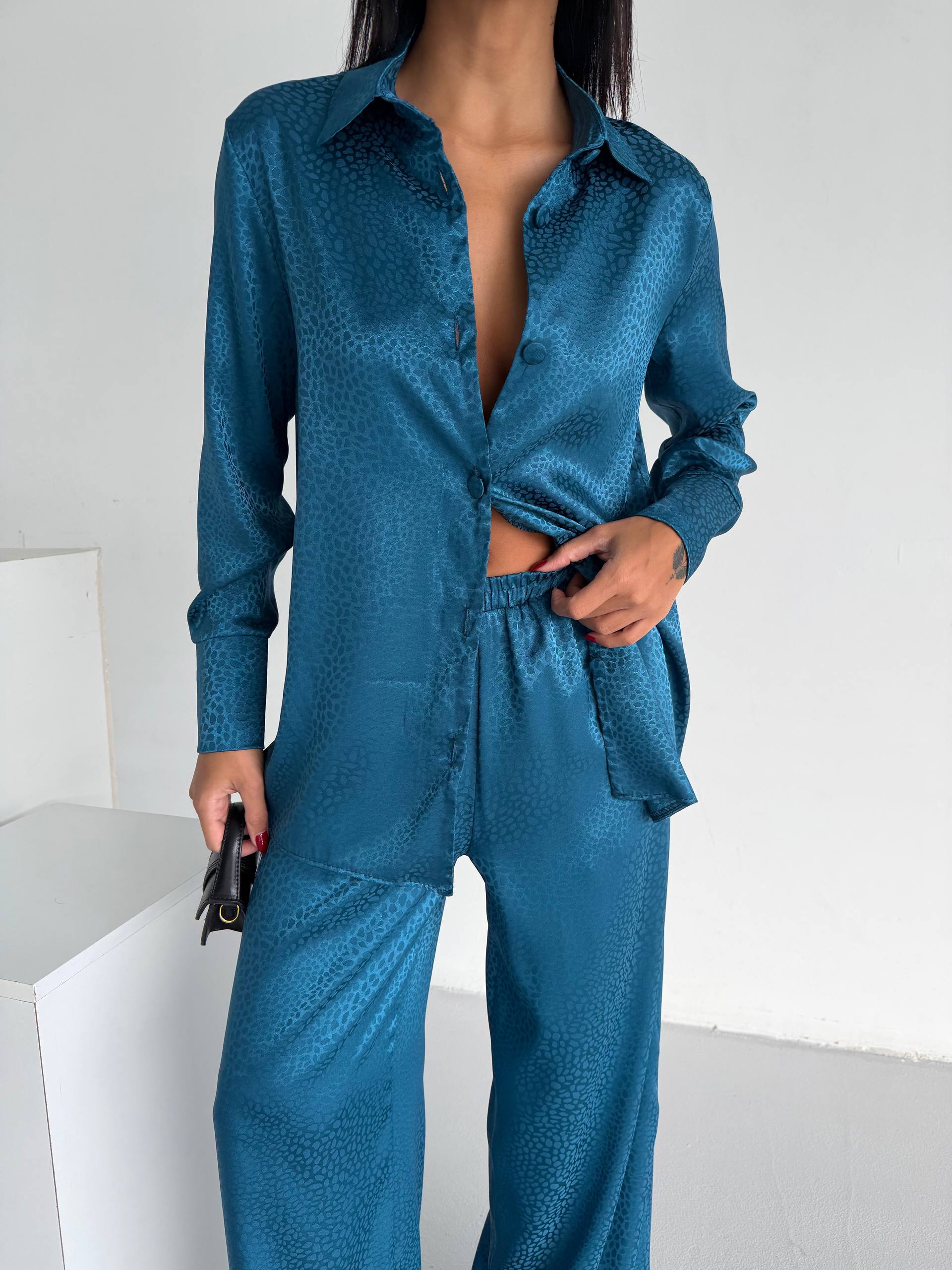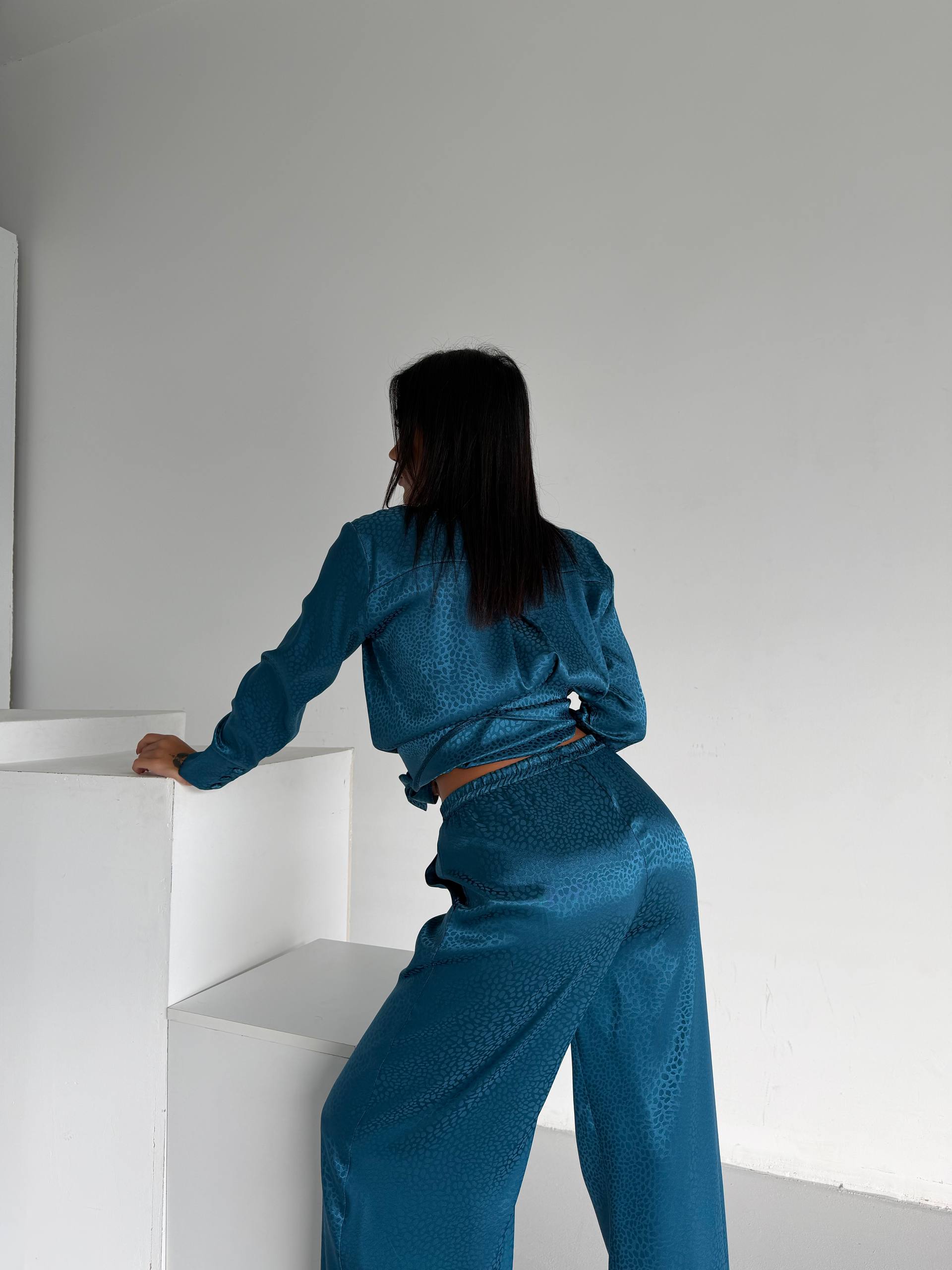 Teal Jacquard Satin Pyjama Set for Women – Textured Luxury Nightwear