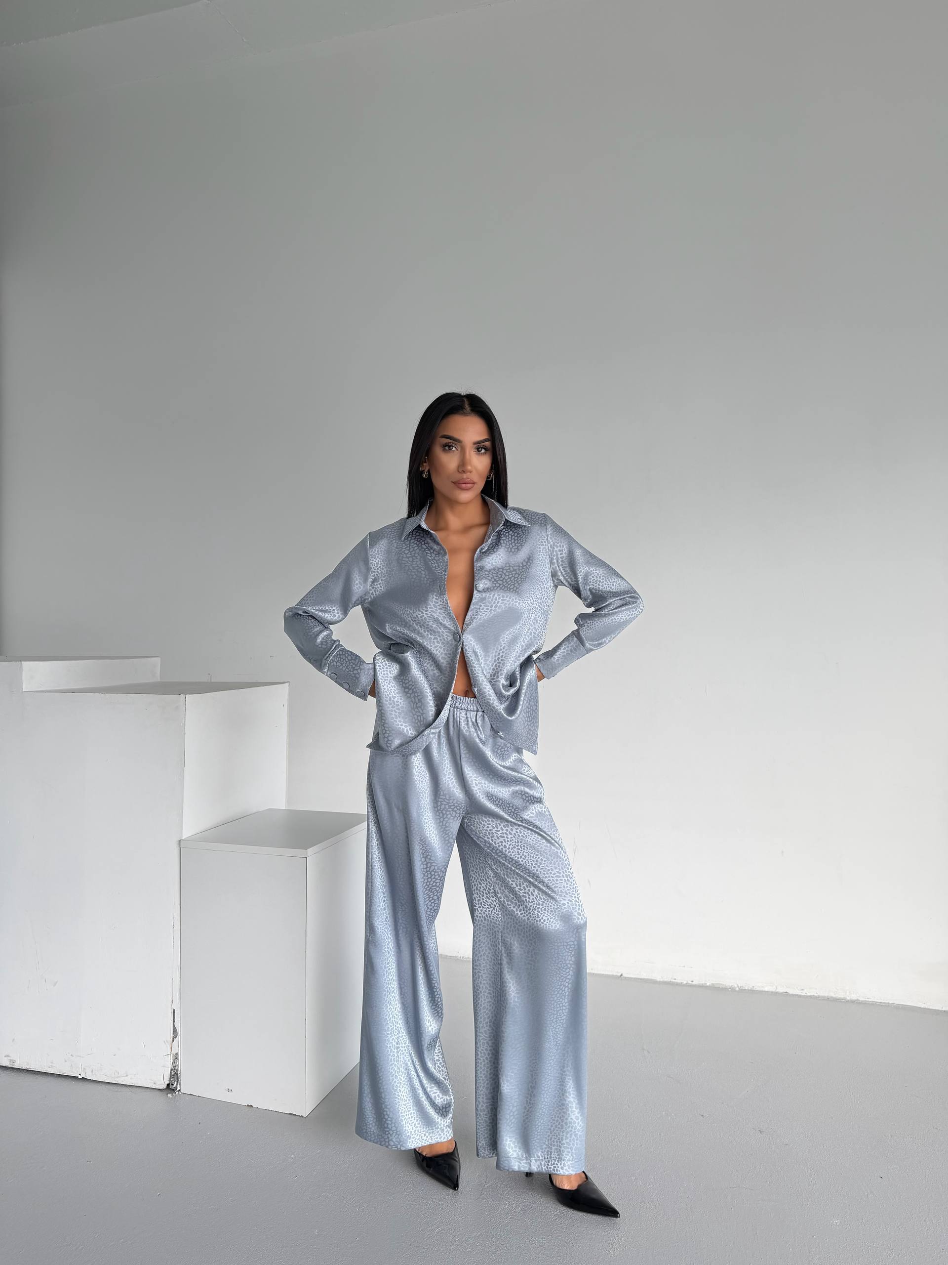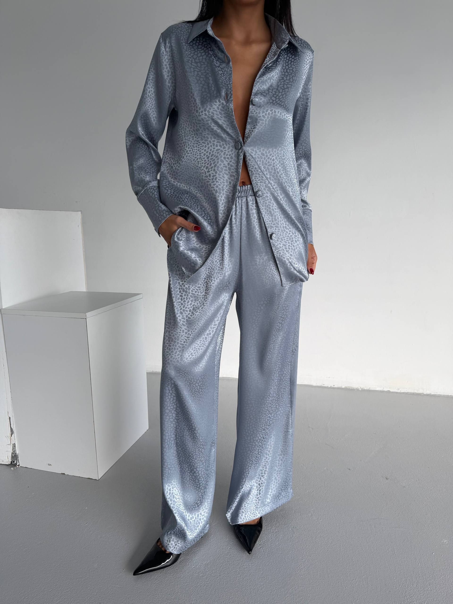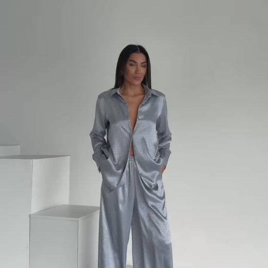 Elegant and timeless, this silver grey pyjama set is crafted from premium Jacquard Satin, featuring a finely woven texture that adds subtle dimension to its smooth satin surface. The cool grey tone reflects light softly, creating a refined and sophisticated nightwear look.